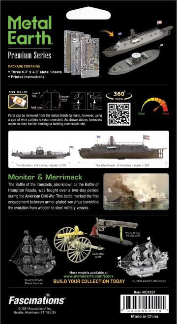 Odkrijte ikonični ladji Ameriške državljanske vojne v obliki podrobnih kovinskih modelov: USS Monitor in CSS Virginia (Merrimack). Ta vrhunska kovinska 3D sestavljanka METAL EARTH ICONX uporablja nerjaveče ploščice z barvnim potiskom in fino lasersko graviranje, ki zvesto ujame oklep, stolpe in palubne detajle.