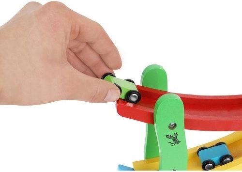 Set vključuje leseno tobogan s 4 raznobarvnimi stezami in 4 avtomobilčki. Vse je narejeno iz lesa, kar zagotavlja visok standard varnosti.
