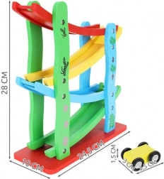 Set vključuje leseno tobogan s 4 raznobarvnimi stezami in 4 avtomobilčki. Vse je narejeno iz lesa, kar zagotavlja visok standard varnosti.