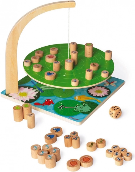 Kateremu bodo živalice najdlje zdržale na lokvanju? Lokvanj je družabna igra za izboljšanje spretnosti in fine motorike. Da bi preživeli v ribniku, morate delovati spretno in strateško! Postavite figure z živalmi na lokvanj tako, da se ne prevrne. Cilj igre je, da živalice ne padejo z lokvanja. Paket vsebuje leseno osnovno ploščo z visečim lokvanjem, 42 kosov lesenih igralnih figur z živalmi in 1 leseno igralno kocko. Dejstvo, da plošča ni popolnoma ravna, ne vpliva na igralnost izdelka. Mali namig: čim bolj previdno postavite figuro živali, tem manj se bo lokvanj zibal. Igra razvija: - spretnost in fino motoriko - strateško razmišljanje - zbranost Primerno za otroke od 6 let.