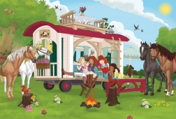 Potopite se v svet SCHLEICH z barvito sestavljanko znamke SCHMIDT, ki prikazuje vzdušje taborjenja ob prikolici. Zahvaljujoč 100 natančno izrezanim koščkom je sestavljanje zabavno in razvija fino motoriko, potrpežljivost in domišljijo. Del pakiranja je tudi izvirna figurica hannovrskega žrebeta Schleich, ki bo razveselila vsakega malega ljubitelja konj.