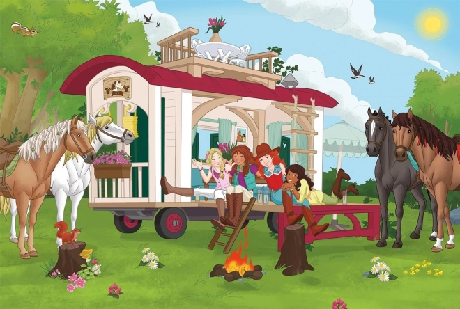 Sestavljanka SCHMIDT Schleich taborjenje ob prikolici, 100 koščkov + figurica žrebeta. Kakovostna zabava za otroke, mere 36,1 × 24,3 cm. Odlično darilo.