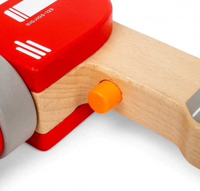 Ta leseni vrtalnik zvesto posnema pravo orodje, vendar brez elektrike in ostrih delov. Otroci lahko ročno vrtijo glavo vrtalnika, s klikastim stikalom preklapljajo domišljijske načine ter zlahka nameščajo magnetne svedre in vijake. Odličen je za igre gradnje poličk ali pohištva in za razvoj praktičnih spretnosti.