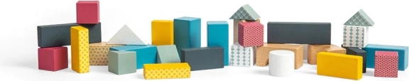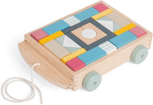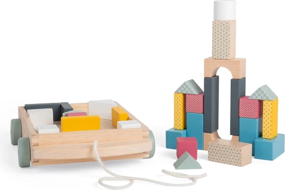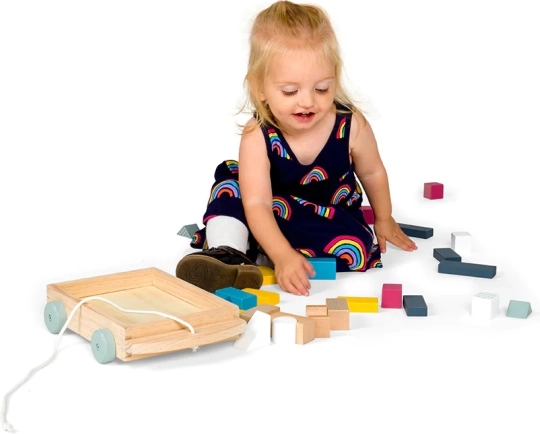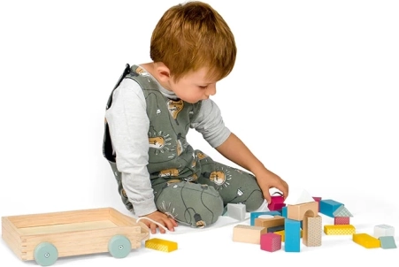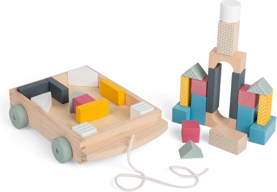 Vlečenje vozička, zlaganje in razvrščanje kock spodbuja ravnotežje, fino motoriko in koordinacijo oko–roka že od 18 mesecev dalje.