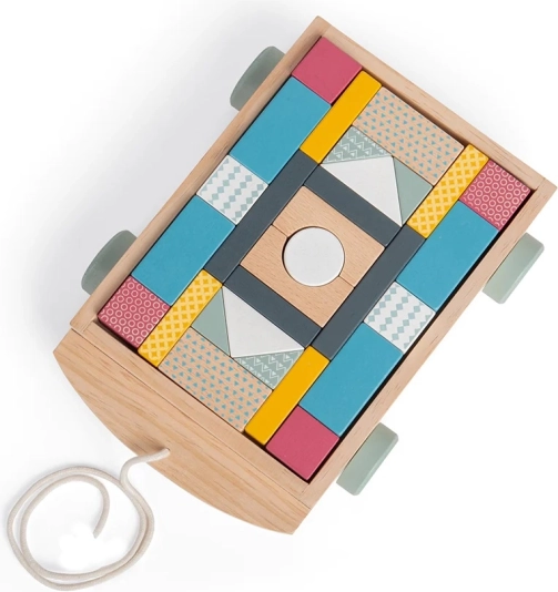 Lesen voziček z 29 barvnimi kockami v modernih pastelnih odtenkih je odlična pomoč pri prvem gradjenju, razvrščanju in učenju. Kocke imajo prijetne dimenzije, dobro sedejo v roko in se enostavno pospravijo nazaj v voziček, ki ga je mogoče zlahka vleči s trpežno vrvico. Igrača spodbuja razvoj ravnotežja, koordinacije in domišljije.