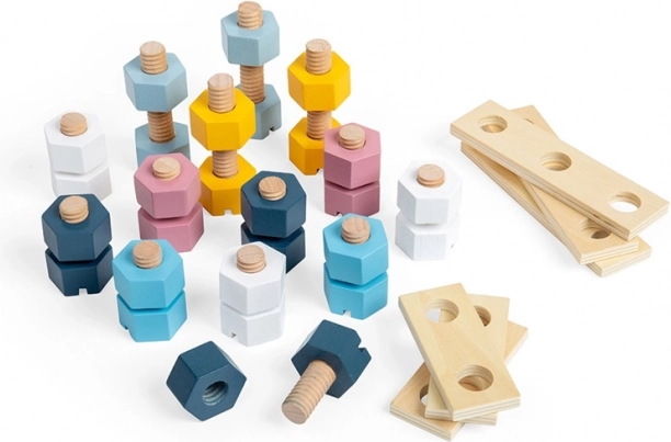 Ta brezčasni leseni komplet matic, vijakov in letvic z odprtinami spodbuja otroke k odkrivanju prvih načel konstrukcijske igre. Nežne pastelne barve, prijetna tekstura lesa in varne oblike spodbujajo čutno zaznavanje in domišljijo.