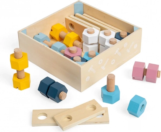 Odkrijte ustvarjalni komplet za najmlajše – lesene matice in vijake v praktični zabojčki znamke BIGJIGS. Na igriv način razvijajo fino motoriko, koordinacijo roka–oko in ustvarjalnost. Zahvaljujoč večjim dimenzijam delov so idealni za otroške ročice, po igri pa jih preprosto shranite v ekološko leseno škatlo iz FSC certificiranega lesa.