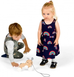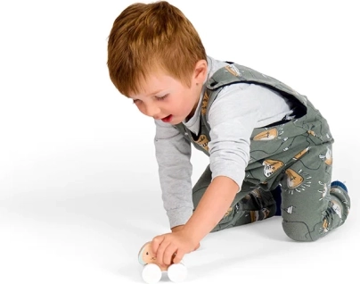 Štirje trdni koleščki z geometrijskim vzorcem gladko drsijo po ravnih površinah, medtem ko se siva vlečna vrvica dobro prilega tudi majhnim ročicam. Igrača pomaga razvijati spretnost, ravnotežje in koordinacijske veščine ter spodbuja aktiven gib in domišljijo.