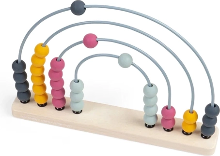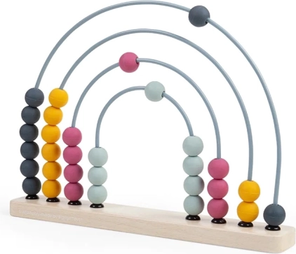 Podstavek je izdelan iz FSC® certificiranega lesa, loki so kovinski, kroglice pa iz silikona kakovosti za stik z živili. Zaradi brezčasnih pastelnih barv in mavrične oblike se prilega tudi kot dizajnerski dodatek. Po koncu igre lahko krasi polico in še naprej vabi k odkrivanju števil.