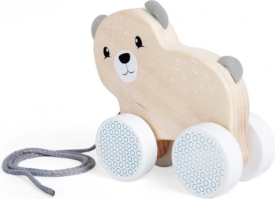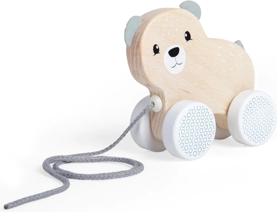 Prisrčen vlečni medvedek iz certificiranega lesa FSC podpira prve korake in igrivo motoriko. Ima varen mehak trak, gladka kolesa z geometrijskim vzorcem in je barvan z otrokom varnimi barvami. Odličen kot prva vlečna igrača za otroke od 1. leta dalje.