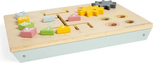Miza vključuje vrsto dejavnosti, ki podpirajo zgodnji razvoj: otroci lahko z lesnim kladivcem zabijajo klinčke, preizkušajo zatezanje navojnih vijakov z živalskimi glavicami, vrtijo lesena zobnika ali vstavljajo oštevilčene trikotnike v prave odprtine. Igrača je izdelana iz etično pridobljenega FSC® lesa in izpolnjuje veljavne evropske varnostne standarde.