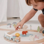 Ta lesena vlakovna proga ob gozdu mladim raziskovalcem ponuja neskončne možnosti za kreativno igro. Proga v obliki osmice vodi mimo očarljivih mušnic, borovcev in gozdnih živali, pa tudi mimo kavarne ali pekarne. Kakovostna izdelava in robustna zasnova zagotavljata, da bo igrača dolgo obstojna in bo otrokom prinesla veliko veselja.