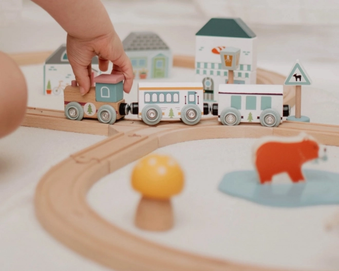 Ta lesena vlakovna proga ob gozdu mladim raziskovalcem ponuja neskončne možnosti za kreativno igro. Proga v obliki osmice vodi mimo očarljivih mušnic, borovcev in gozdnih živali, pa tudi mimo kavarne ali pekarne. Kakovostna izdelava in robustna zasnova zagotavljata, da bo igrača dolgo obstojna in bo otrokom prinesla veliko veselja.