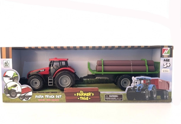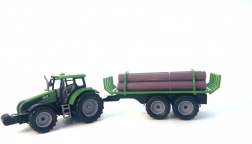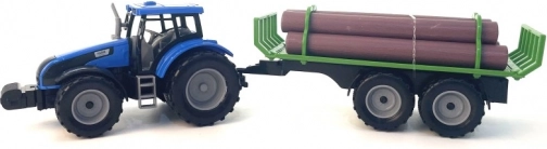 Priklopnik natovorjen s hlodi in različne barve traktorja veščajo zabavo pri igranju na kmetijskih in gradbenih scenarijih.