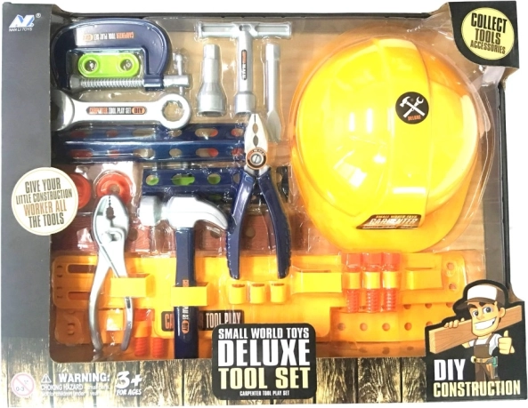 Vsebuje široko paleto pripomočkov, kot so kladivo, čelada in izvijači, vse izdelano iz plastike za varno uporabo.