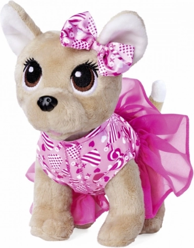 Plišasti kužek čivava v prazničnem slogu. Plišasti kužek v bleščeči obleki z vzorcem srčkov in ujemajočo se pentljo. Shranjen v bleščeči torbici v obliki srca. Najboljši prijatelj – prikupna mala čivava je visoka 20 cm in je izdelana iz mehkega pliša.