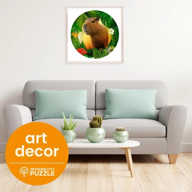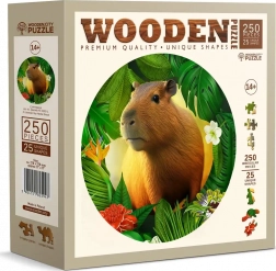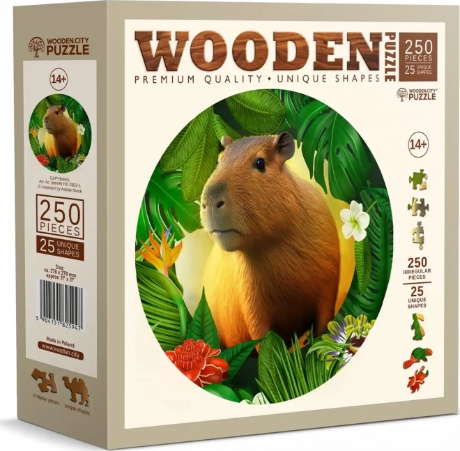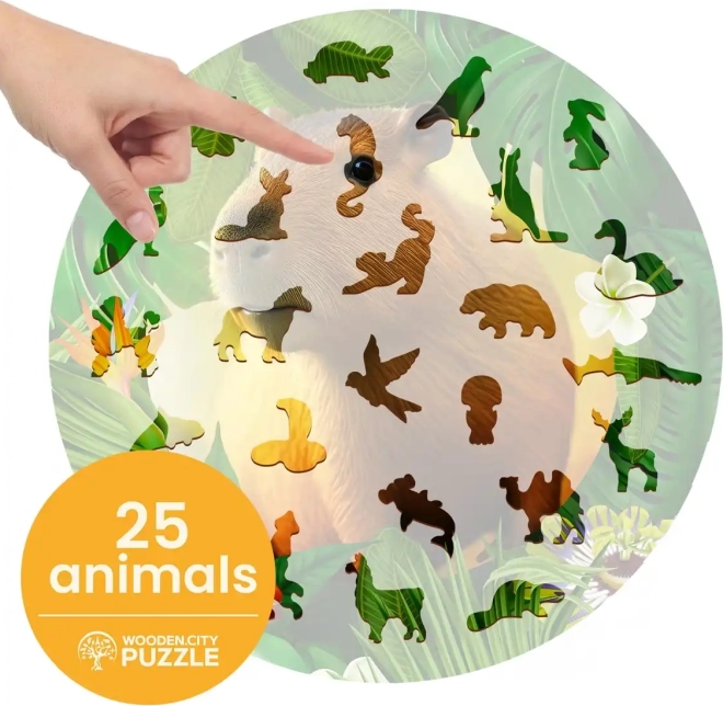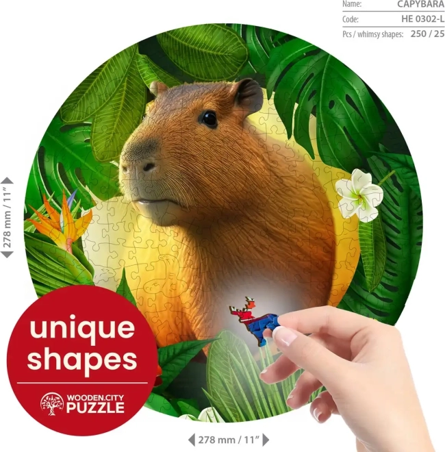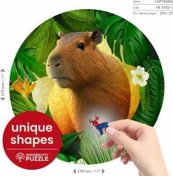 Lesene puzzle WOODEN CITY z motivom kapibare prinašajo edinstveno izkušnjo sestavljanja. Posebno oblikovani koščki, od katerih je del v obliki živali, bodo razveselili vsakega ljubitelja izvirnih puzzlov. Z laserjem poudarjeni detajli dodajo sliki globino, posamezni oblikovani koščki pa lahko samostojno stojijo kot majhne figurice.
