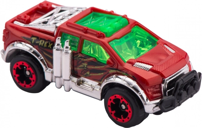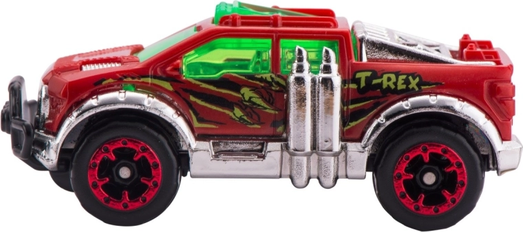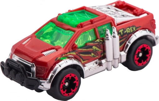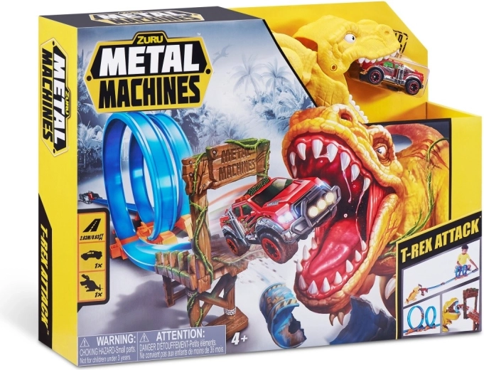V kompletu je avtomobilček Metal Machines, komponente za sestavo 2,63 m dolge steze in figurica T-rexa, ki lovi vozila na poti. Premagaj dinozavra, ki terorizira mesto, z močjo kaskaderske hitrosti! Ta avtocesta znamke ZURU bo igralni prostor napolnila z urami napetih dirk in epskih spopadov!