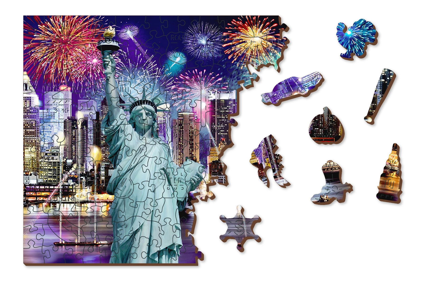 Podajte se v Nočni New York z našimi razkošnimi lesenimi puzzle 2v1. Natančno izrezane iz kakovostnega materiala ponujajo edinstveno oblikovane koščke, ki samostojno tvorijo živali, predmete ali zgradbe, hkrati pa so prijazne do okolja.