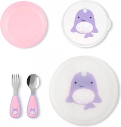 Naš komplet jedilnega pribora ZOO Narval je idealen za spodbujanje otrok k samostojnemu prehranjevanju. Komplet vključuje: