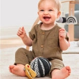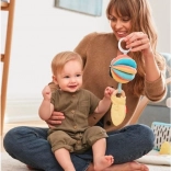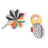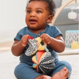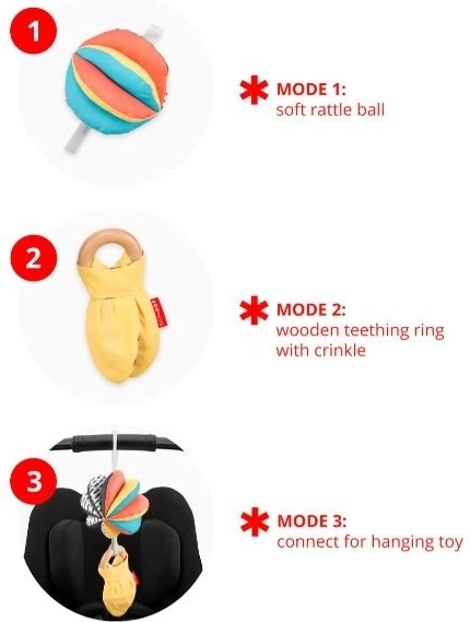 Naša otroška igrača 3 v 1 DISCOVEROSITY omogoča tri različne načine igranja, saj je mogoče posamezne elemente uporabljati samostojno ali jih združiti. Mehka ropotuljica ima na eni strani kontrastni vzorec, na drugi pa izrazite barve, medtem ko je lesen obroč izdelan iz trajnostnih materialov. Ta celostna zasnova je idealna tako za prijem kot za grizenje.
