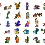 - z edinstveno oblikovanimi koščki, ki predstavljajo znane zgradbe, predmete ali živali glede na motiv