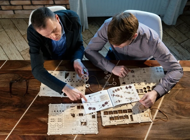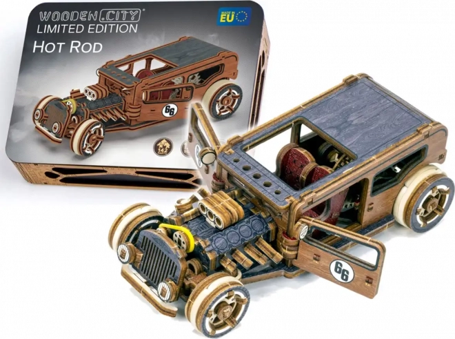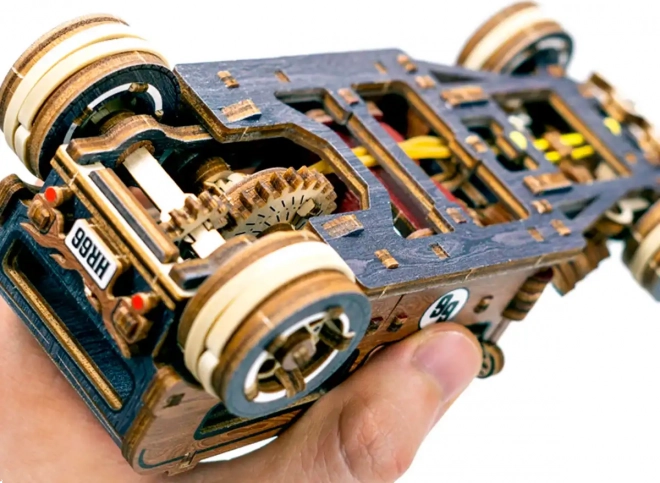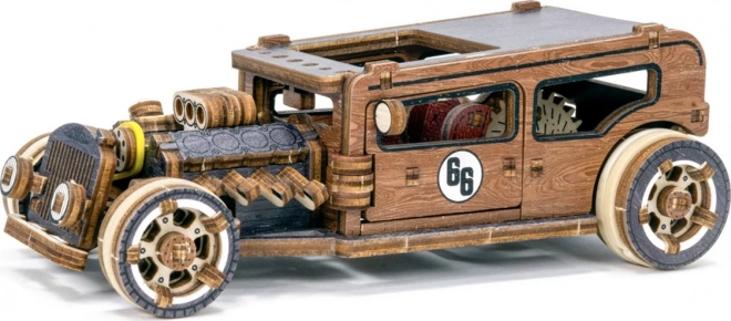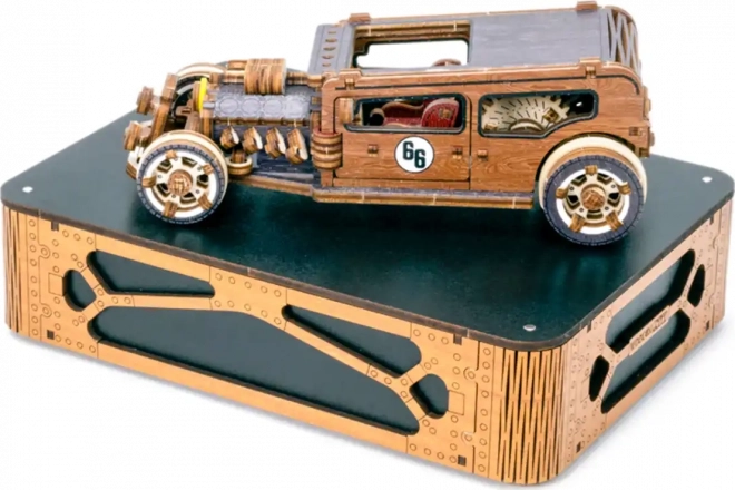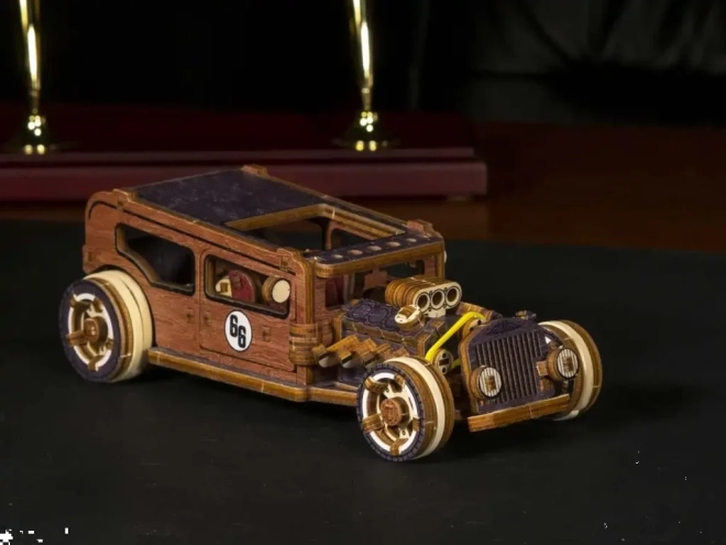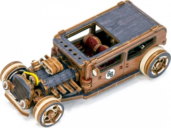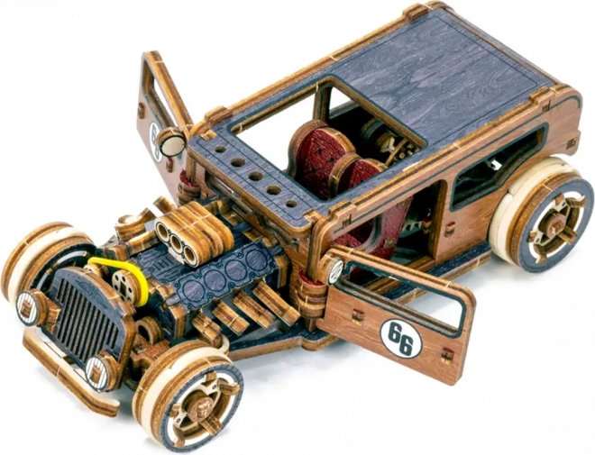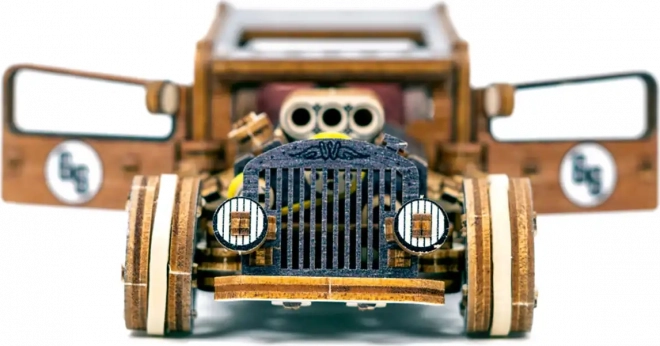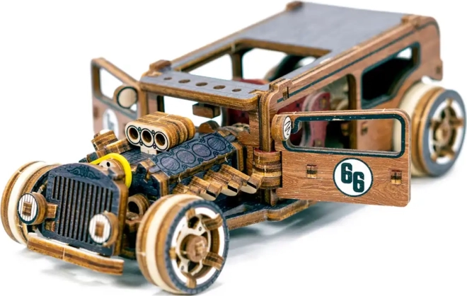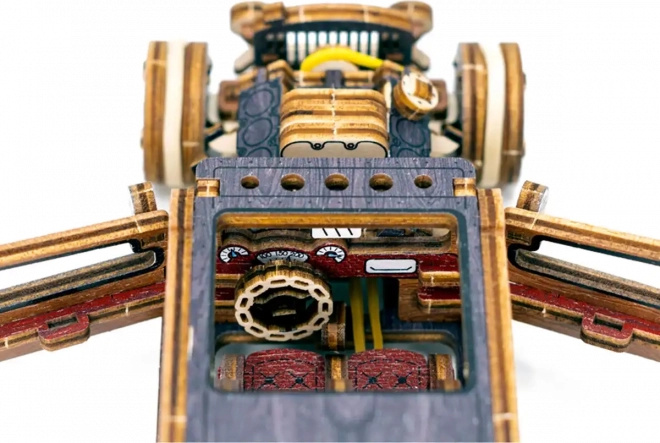Ta mehanski model WOODEN CITY hot rod v merilu 1:32 prinaša avtentično izkušnjo gradnje in mehanike. V notranjosti najdete podroben motor, dvojni sedež in prestavno ročico, med vožnjo pa boste cenili vztrajnostni pogon in povratna kolesa. Zahvaljujoč natančnemu izrezu delov iz brezove vezane plošče se vse popolno zaskoči – brez kapljice lepila.