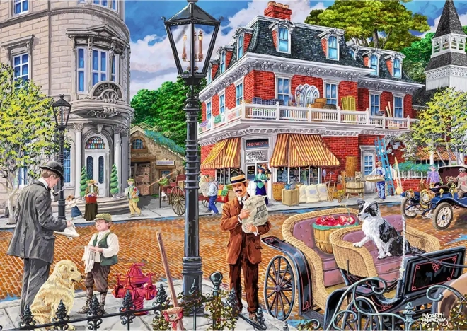 Živahna ilustracija z zgodovinskimi hišami, vozovi in živahno tržnico spremeni sestavljanje v vizualno privlačno izkušnjo za otroke in odrasle.