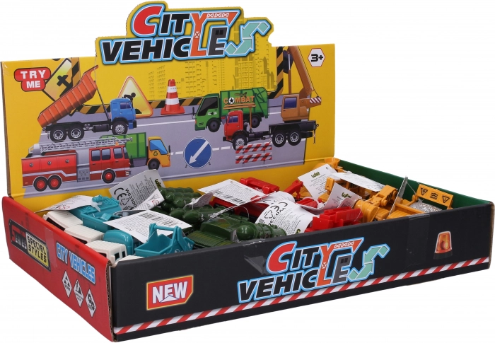 Avtomobilček na poteg nazaj z gradbenimi in vojaškimi motivi. Mere 8,5 × 6 × 4 cm, 12 različic, pakiranje display box 12 kosov. Odlično drobno darilo.