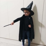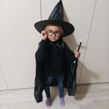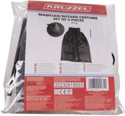 Ta stilski čarovniški kostum ponuja vse, kar otroci potrebujejo za ustvarjanje učinkovite in varne preobleke. Lahek plašč iz prijetnega materiala elegantno pada in zahvaljujoč zavezovanju dobro ostane na mestu. Špičast klobuk se po odvzetju sam razpre in pričara “wow” učinek. Okrogla očala brez stekel so udobna in varna pri igri, palica iz trpežne plastike pa odlično dopolni vsak trik.