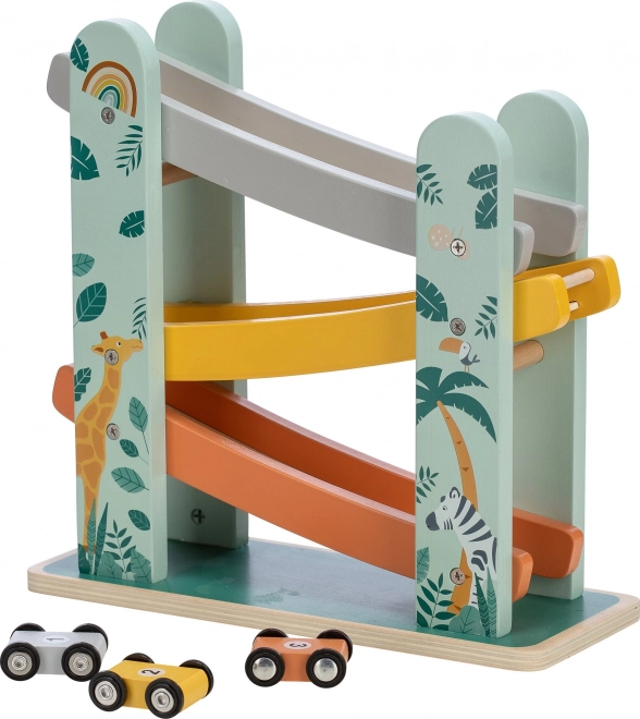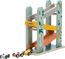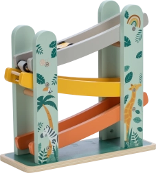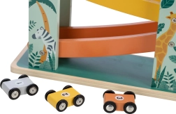 Predstavljamo vam odlično leseno tekmovalno stezo s tremi avtomobilčki! Uporabite barvno raznoliko možnost steze in opazujte, kako vaši otroci z navdušenjem spremljajo, kako avtomobilčki izvajajo salte iz enega nivoja na drugega. Dopolnjena je bila s čudovitimi motiviranimi ilustracijami živali, ki ji dajejo igriv značaj. Avtomobilčki imajo gumirana kolesa za stabilno vožnjo in dvosmerni dizajn.