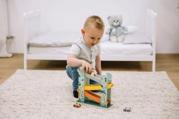 Zaradi nagnjenih prog in majhnih vozil igrača spodbuja razvoj fine motorike in koordinacijo roka-oko.
