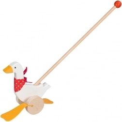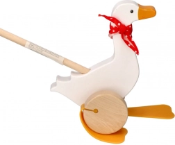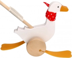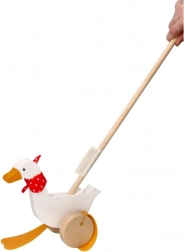 Otroška gos Berta iz kakovostnega lesa navduši s klasičnim dizajnom z rdečo pikčasto ruto in izrazitimi »plavalnimi« nogicami, ki se med potiskanjem prikupno premikajo. Dolga palica olajša vodenje igrače in spodbuja aktivno gibanje otrok.