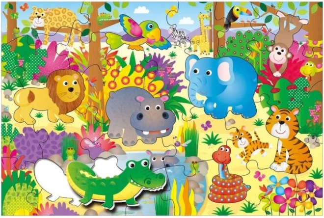 Odkrijte zabavno in poučno sestavljanje s talnimi puzzli za otroško sobo – barvita džungla z levom in njegovimi prijatelji. Veliki, trdni kosi odlično sedejo v roko, 8 unikatnih kosov v obliki živali lahko uporabite tudi kot šablone za risanje. Spodbuja fino motoriko, koordinacijo oko–roka in zbranost. Primerno za otroke od 3 do 6 let.
