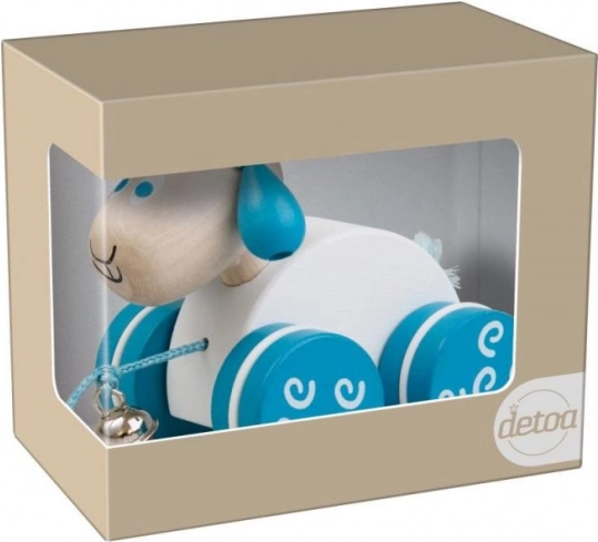 Lesena vlečna ovčka z zvončkom v EKO pakiranju. Varna igrača za otroke od 1. leta, podpira prve korake, motoriko in čutno zaznavanje.
