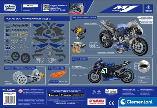 Odkrijte svet tehnike s stavebnico Laboratorio di Meccanica – Yamaha M1. Ta podroben model dirkalnega motocikla iz MotoGP združuje zabavo in učenje: razumeli boste, kako delujejo menjalnik, vzmetenje in prenos moči z verigo. Deli so zasnovani za čvrsto konstrukcijo in avtentičen videz.