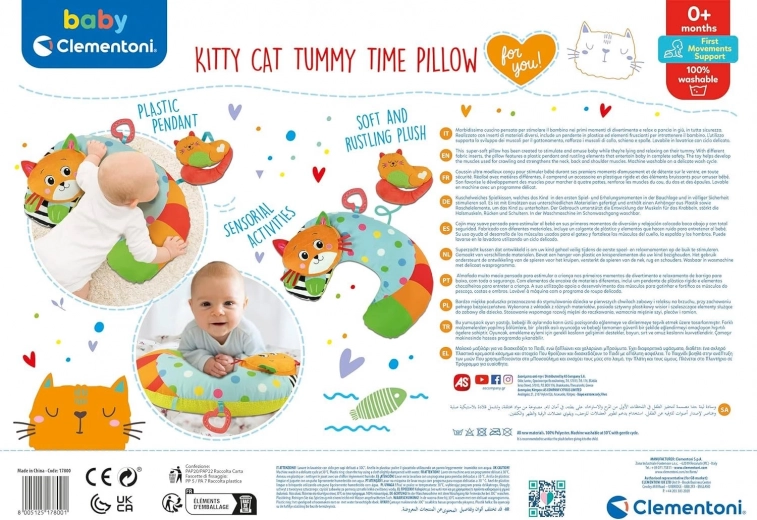 Raznolike teksture prevleke stimulirajo dotik, šumeče mucko in mačerske brčice spodbujajo radovednost in koordinacijo, medtem ko plastični srček na zanki služi kot praktično grizalo pri izraščanju zob. Blazinica je enostavna za vzdrževanje – lahko se pere na nežnem programu.