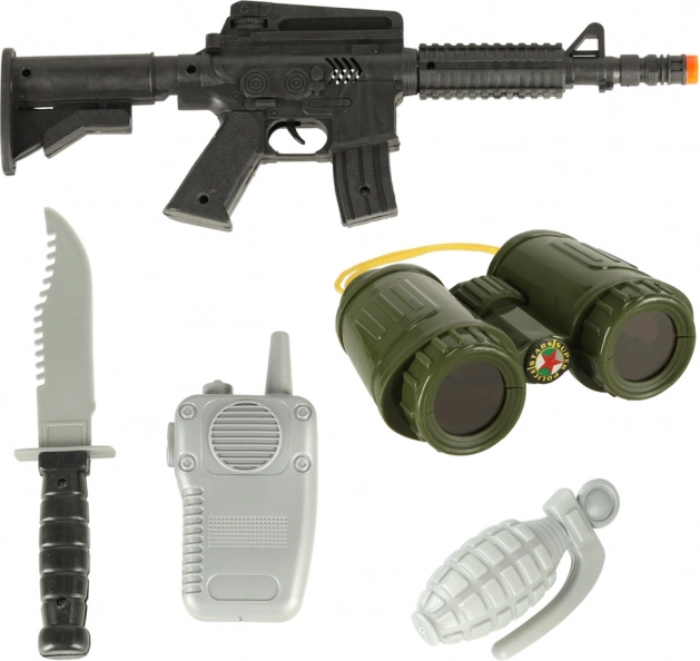 Komplet vključuje plastične dodatke, kot so orožje, nož, oddajnik in drugi, za realistično igro in razvoj domišljije.