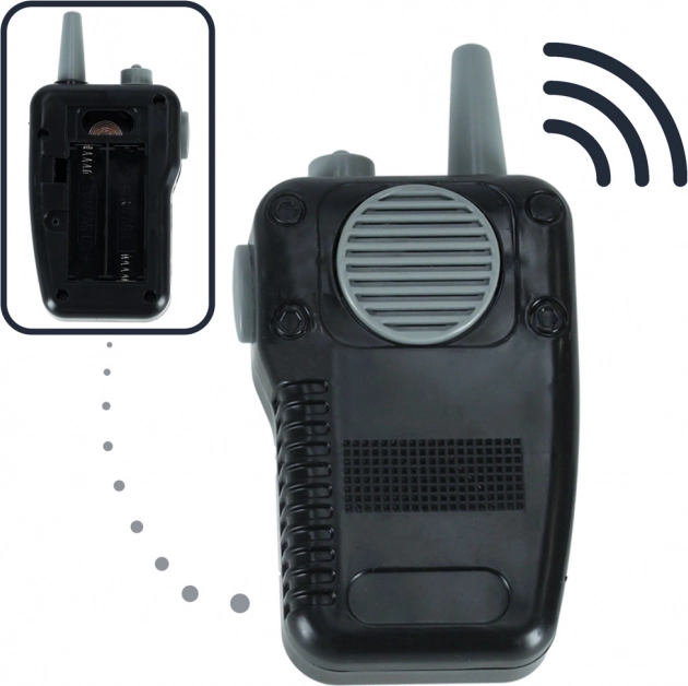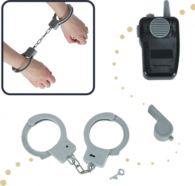 Vključuje kratkovalko, lisice, ključe in piščalko, kar omogoča realistično igranje vlog in zabavo.