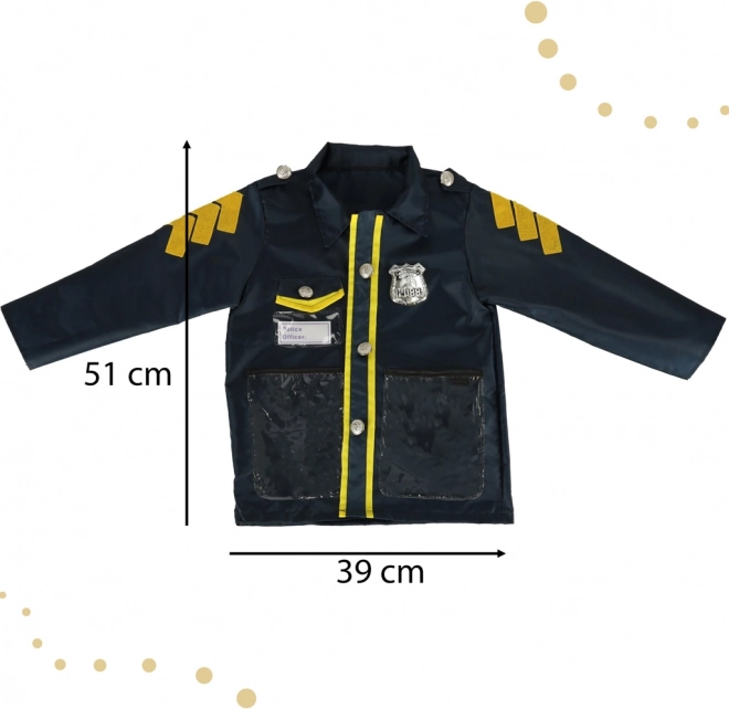Kostum vsebuje plašč in klobuk z avtentičnimi detajli, kot so značke in drugi dodatki, ki posnemajo pravo policijsko uniformo.