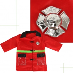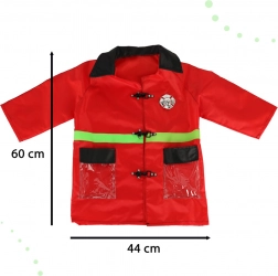 Otroški kostum vsebuje jakno, ki je oblikovana, da izgleda kot prava gasilska jakna, zahvaljujoč rdeči barvi in odsevnim zelenim elementom.