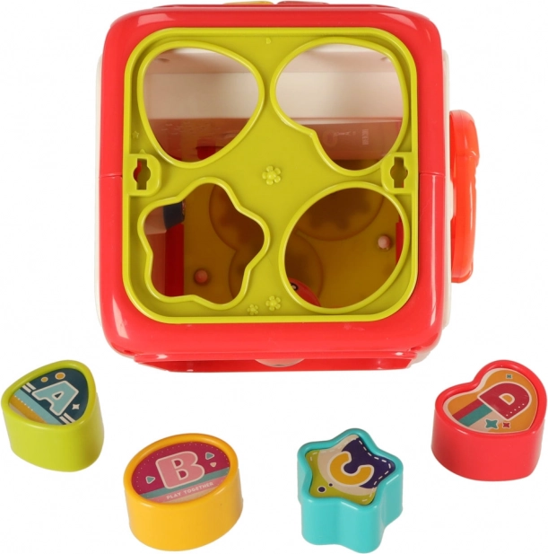 - Sestavljena je iz kocke in štirih blokov, ki podpirajo prepoznavanje oblik in barv.