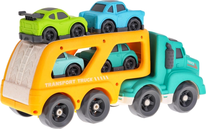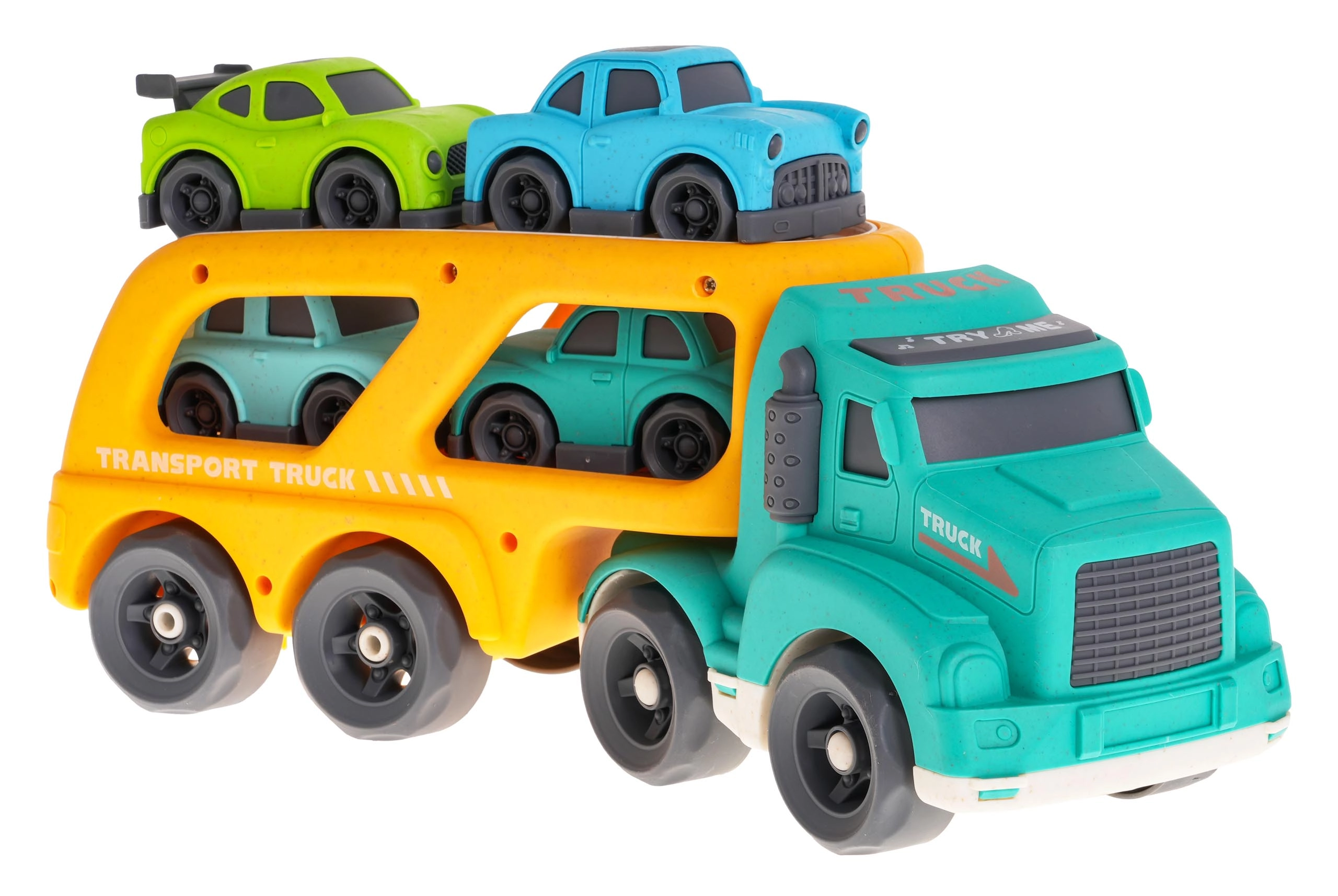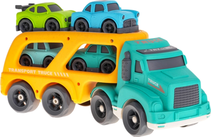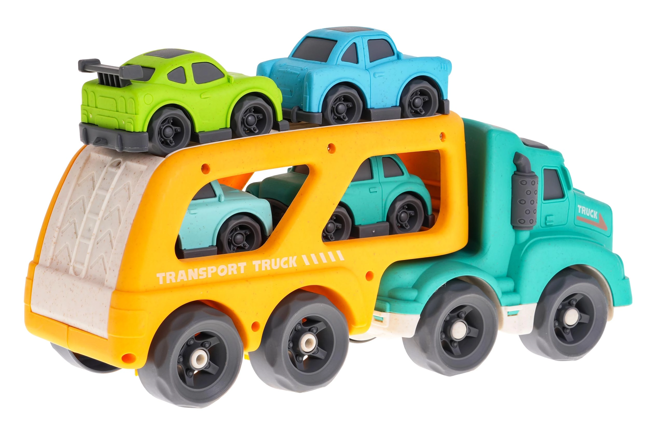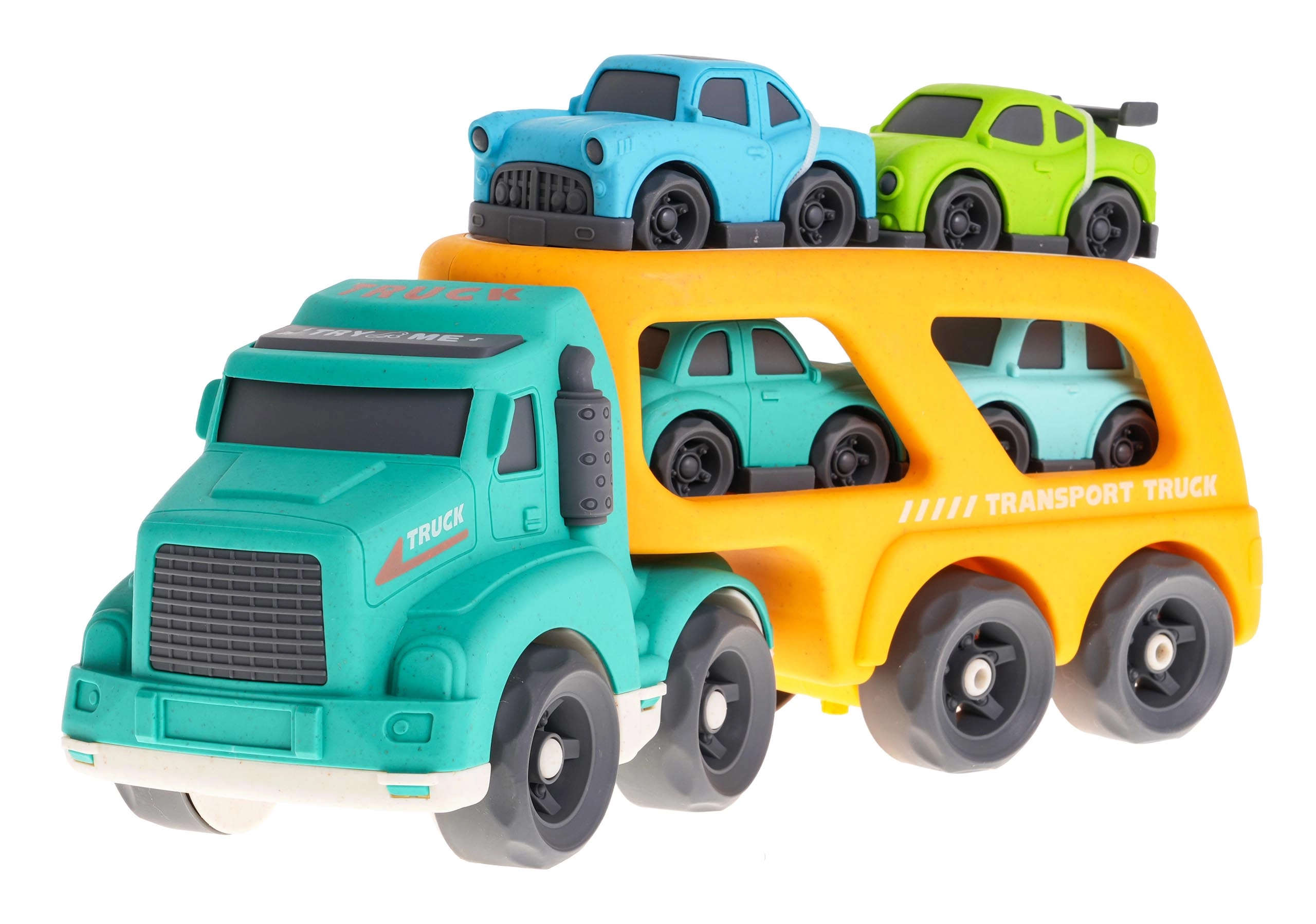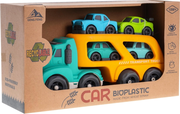Zabavno vlečno vozilo s prikolico in štirimi avtomobilčki iz ekološke BIO plastike bo razveselilo otroke od 18 mesecev. Ponuja svetlobne učinke, realistične zvoke motorja, vzvratne vožnje in hupo ter veselo melodijo. Prikolico je mogoče odklopiti, robusten material pa je varen, nestrupen in trpežen. Baterije 3× LR44 so priložene.