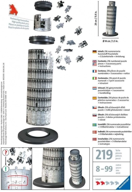 Ravensburger ponovno prinaša inovacijo v svet sestavljank s 3D modelom slavnega poševnega stolpa v Pisi. Ta model vsebuje posebne kose, ki se natančno prilegajo na svoje mesto in ne zahtevajo lepila, zato je celotno delo trpežno in stabilno.