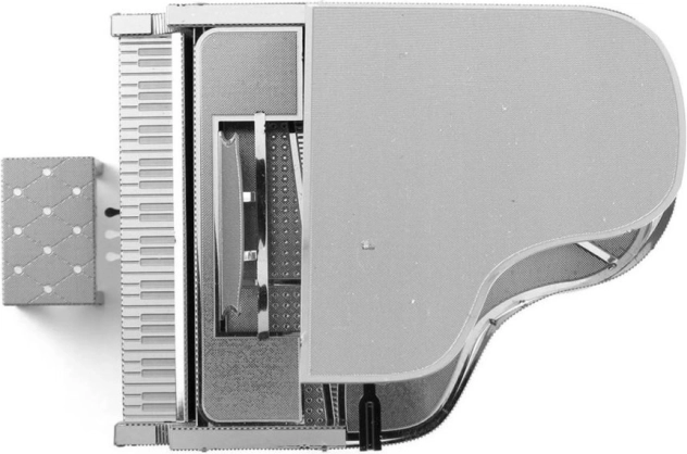 Lasersko gravirani deli zvesto prikazujejo klaviaturo, pedala in površino klavirja za izjemno realističen videz.