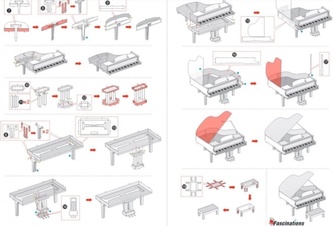 Končni klavir velikosti približno 7,5 × 6,8 × 5,9 cm bo postal nepogrešljiv okras doma, v pisarni ali v šolski vitrini. Pakiranje vsebuje 2 jekleni ploščici in ilustriran priročnik; za montažo priporočamo majhne strižne klešče in fine ploščate klešče (nista priloženi).