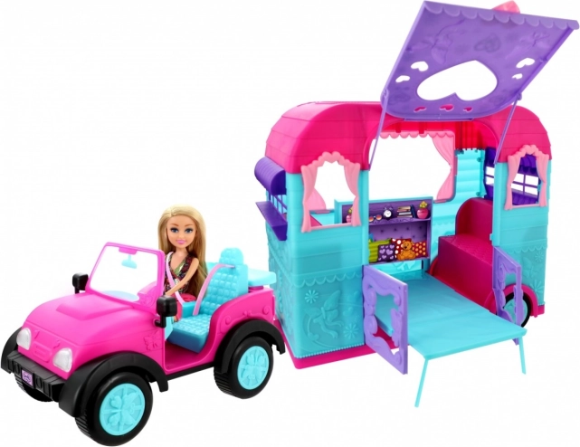 Ta barvit igralni set prinaša vse za male popotnike: eleganten odprt džip, priključen na prikolico z dekoracijami, in punčko velikosti približno 26,5 cm. Otroci bodo uživali ure domišljijske igre – od izletov v naravo do taborjenja pod zvezdami.