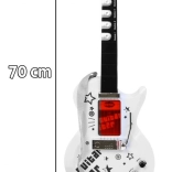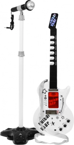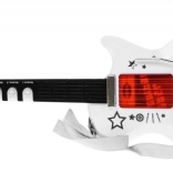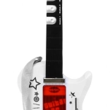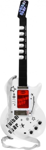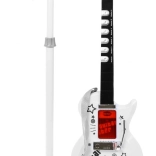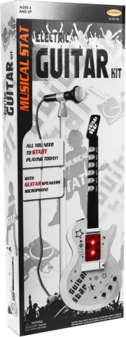 | | Edinstvena električna kitara za bodoče kitariste skupaj z mikrofonom v kompletu. Kitara je izjemno navdihujoče glasbilo iz skupine brenkal, ki ima zelo pomembno vlogo v bluesu, countryju, flamenku, rock glasbi in v številnih oblikah pop glasbe. Otrok že v prvih letih življenja kaže zanimanje za igranje s igračami, pleše, poje in preizkuša preprosta glasbila. Prisotnost glasbe v razvoju otroka ima nedvomno pozitiven vpliv. Talent, odkrit v tako zgodnji fazi, ima možnost, da se v prihodnosti močno razvije, zato tega trenutka ne gre zamuditi. Če vaš otrok z nepopisnim navdušenjem gleda kitariste, se pretvarja, da igra na namišljeno kitaro in ima občutek za ritem – potem ima morda talent za igranje katere koli kitare. Igrača je opremljena s 6 kovinskimi strunami, 3 kitarovskimi zvoki, 7 melodijami in 12 kratkimi soli. | Vsebina kompleta | - kitara z nastavljivim paščkom (napajanje z 3 baterijami tipa AA 3 x 1,5 V – niso priložene), - mikrofon za ojačanje glasu, - nastavljivo stojalo (2 nivoja), - nastavitev višine mikrofona, - kabel za MP3, |