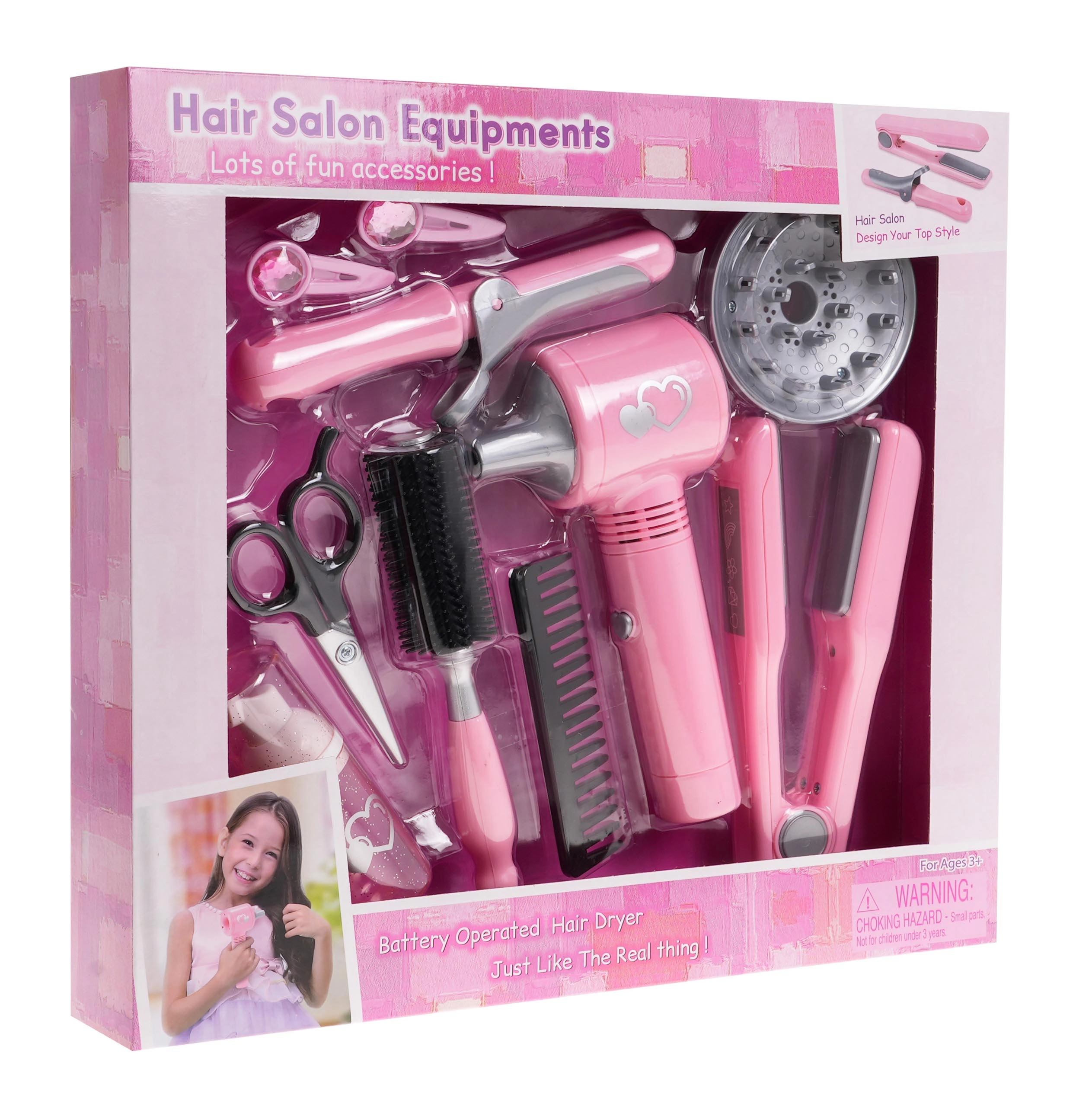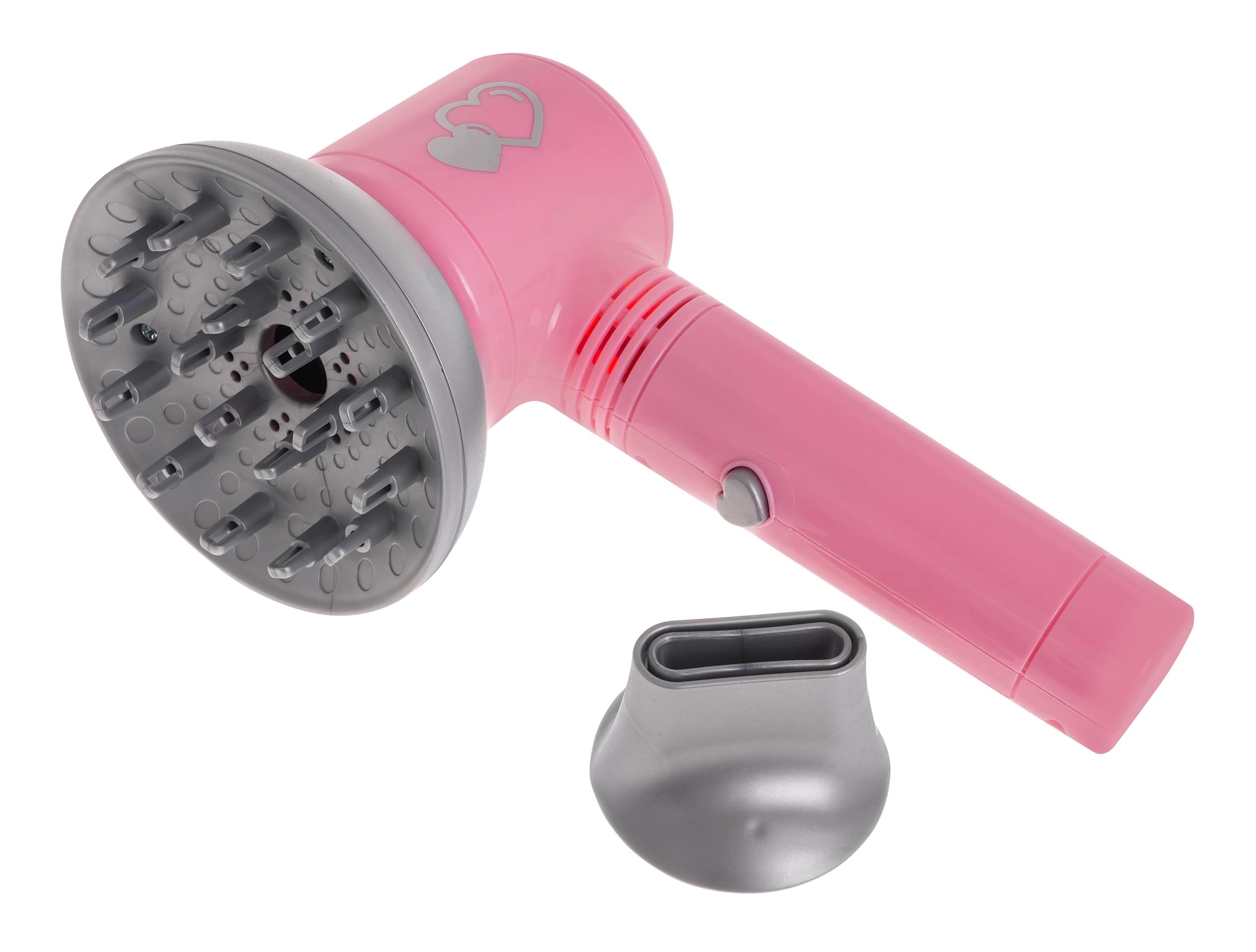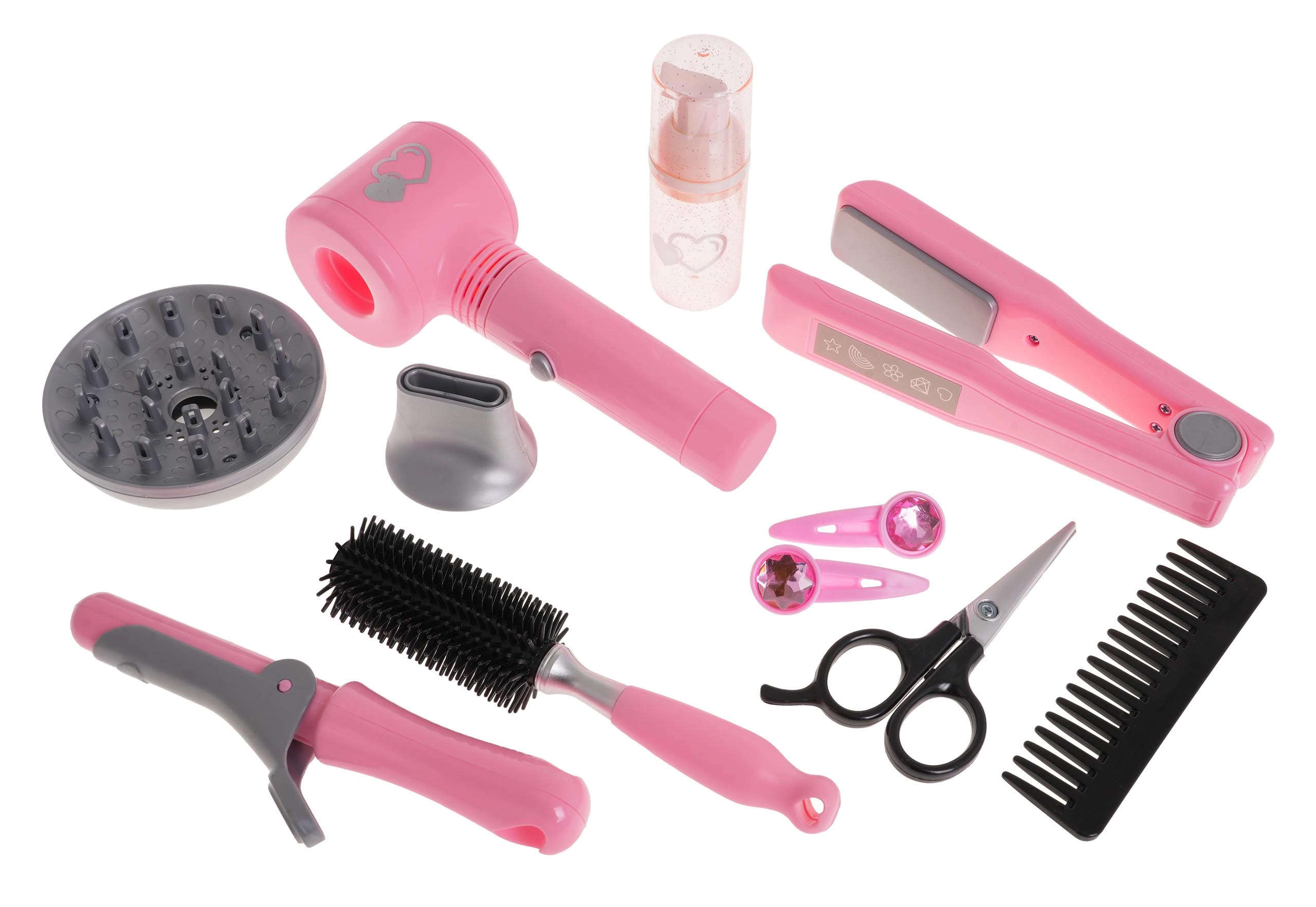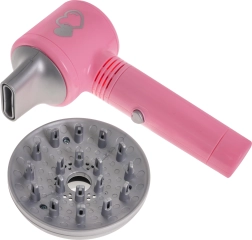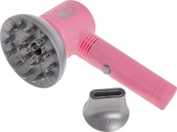 Otroški komplet frizerskih orodij vključuje vse, kar majhen frizer potrebuje za prve poskuse oblikovanja las. Sušilec poganjajo baterije in ponuja nežen pretok zraka, ki zvesto simulira pravo sušenje las. Vsebuje tudi dva zamenljiva nastavka - difuzor in koncentrator.