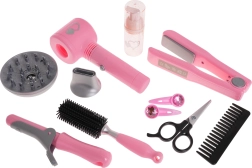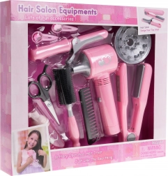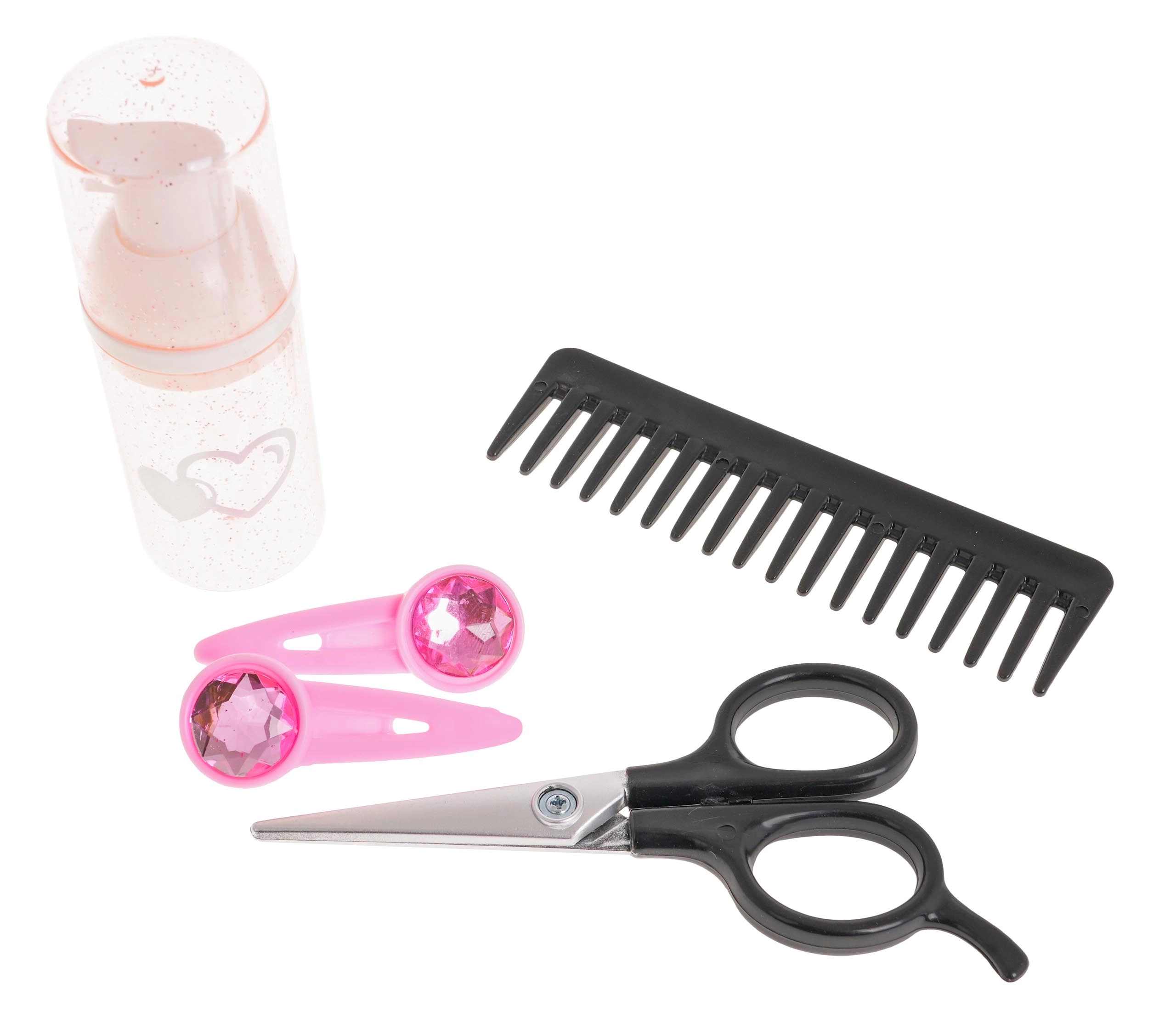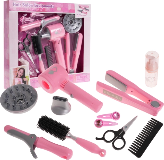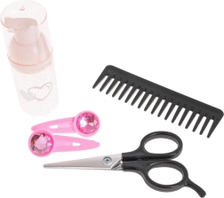 Komplet vsebuje tudi kodralnik in ravnalnik za lase, glavnik, krtačo, škarje, stekleničko in sponke za lase, kar zagotavlja vse potrebno za kreativno igro.